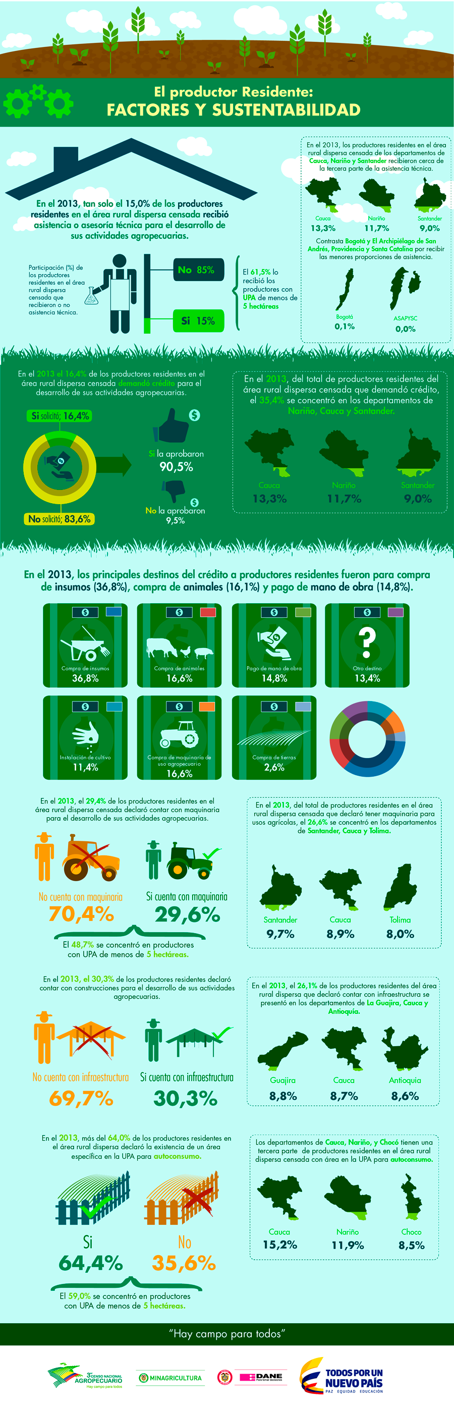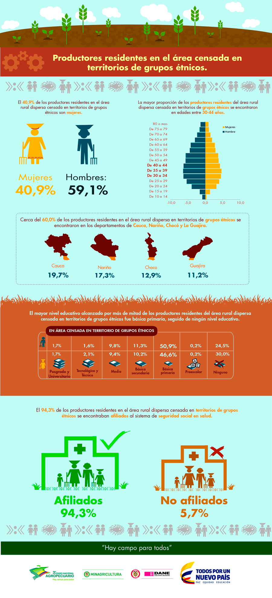 También conocimos que los departamentos que tienen mayor área en cultivos, dentro del total nacional, son Antioquia y Cauca y que más de la tercera parte de los productores residentes en el área rural dispersa censada son mujeres.